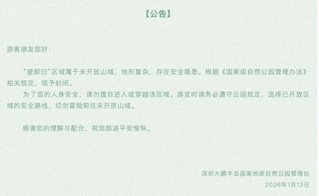 1月13日晚,深圳大鹏半岛国家地质自然公园发布公告称,“望郎归”片区属于未开放山域,地形复杂,存在安全隐患。根据《国家级自然公园管理办法》相关规定,现予封闭。 该公告提醒,“为了您的人身安全,请勿擅自进入或穿越该区域。游览时请务必遵守公园规定,选择已开放的安全路线,切勿冒险前往未开发放山域”。