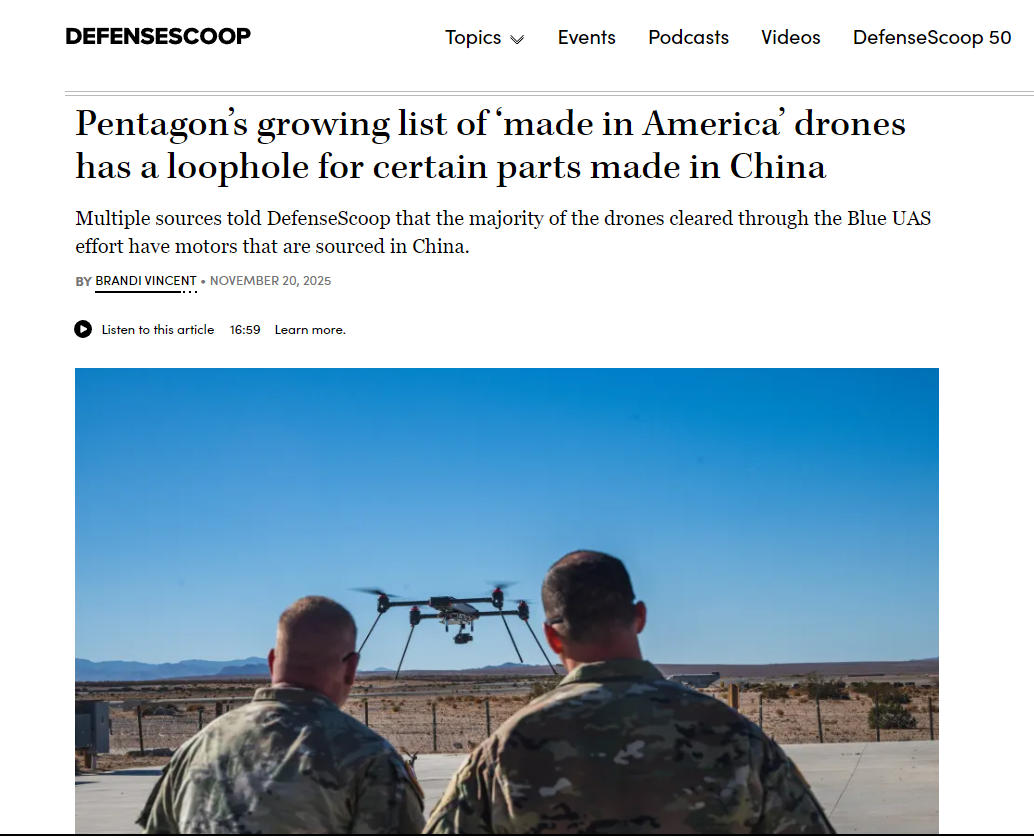 但这9年来,美国军方和政府单位也没少使用大疆无人机。自2017年以来,美军多次为其精锐部队采购大疆无人机,去年9月,美国“战争部”(国防部)官网也介绍了美军使用大疆经纬M350 RTK无人机,并在演习中发挥“至关重要作用”的案例。此外,美国的许多警察局、消防队等也顶着压力,照常使用大疆,美国本土无人机公司Impossible创始人史宾塞·戈尔(Spencer Gore)就曾痛斥,“有1000个美国警察部门正在使用国土安全部的拨款购买中国大疆无人机”。 “美国制造”能补位吗?不太行,外媒普遍认为,美国无人机贵而且性能差、容易坠机,完全无法与大疆匹敌,波兰地理信息专家Aleksander Buczkowski在文章中提到,美国有急救人员报告格“高出8到14倍”的美国无人机性能却“严重失败”;有警长抱怨美国造无人机在18个月内接连坠毁了5架(大疆则0损失);还有用户反映,美国造无人机不能在夜间飞行、无法完成夜间搜救。 无人机“美国制造”?缺技术,且依赖中国零件 美国无人机为何一直发展不起来?外媒分析,这涉及技术、人才、供应链等多方面原因。 技术,是绕不过去的问题,再小的无人机也要涉及飞行控制、通信、导航甚至探测感知等一系列技术。奥地利影视行业网站CineD就指出,美国Skydio无人机的相机图像质量、自主飞行能力都不如大疆,创新也不如大疆快。美媒Commercial UAV News在题为《为何大疆禁令未能催生出美国本土无人机的繁荣?》的文章中还提到,无人机还要比拼简单易用程度、配套服务等。 人才,是发展这一高科技产业的核心基石。Commercial UAV News 网站亦指出,美国无人机厂商还缺乏合格人才,且依赖移民的技术工人,而美国当前收紧的签证政策,更是让这一问题雪上加霜。