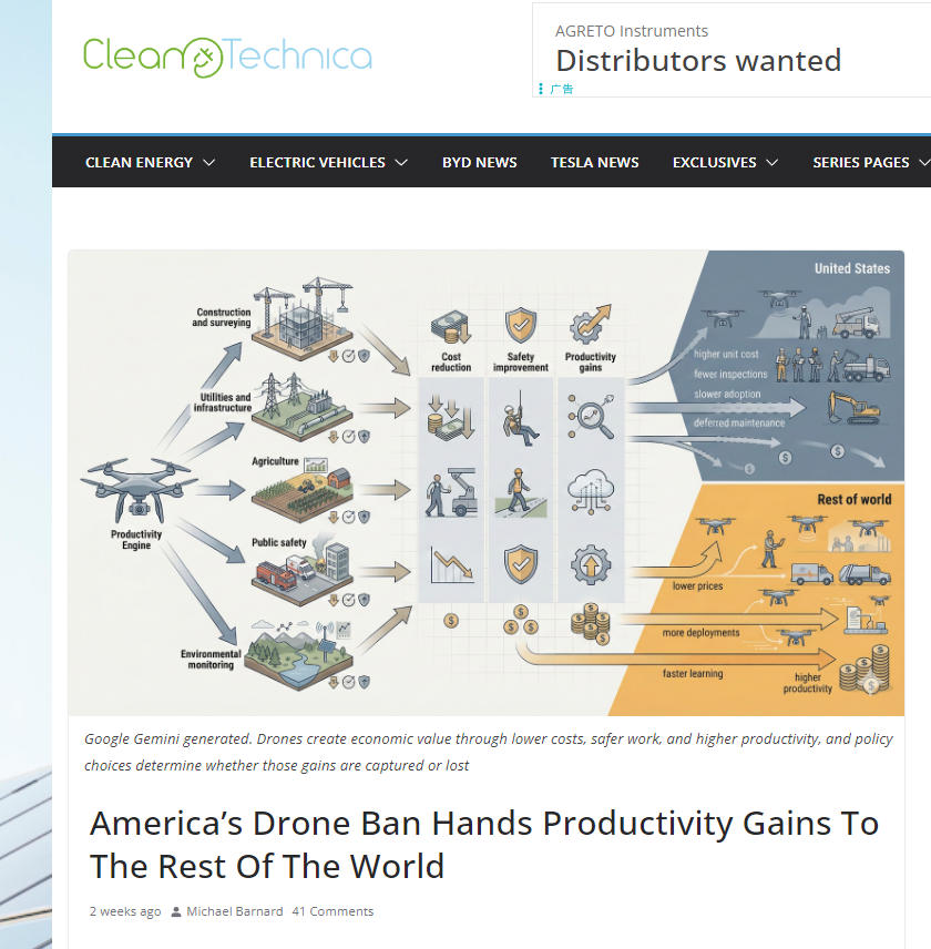 而其它国家能买到更多的大疆无人机,则必然也会赋能到他们的各行各业。Clean Technica网站认为,美国的禁令“将又一次助力世界各国实现对其的跨越式赶超”,这扼杀赋能型的新技术,却又拿不出替代品,长此以往,美国会落后,其它国家会赶上—— 而这并非因为他国更高明,只是因为它们能使用先进的工具,让工作更低成本、更安全且更高效率。文章在结尾说,在美国后退时,世界也在继续前行。 |