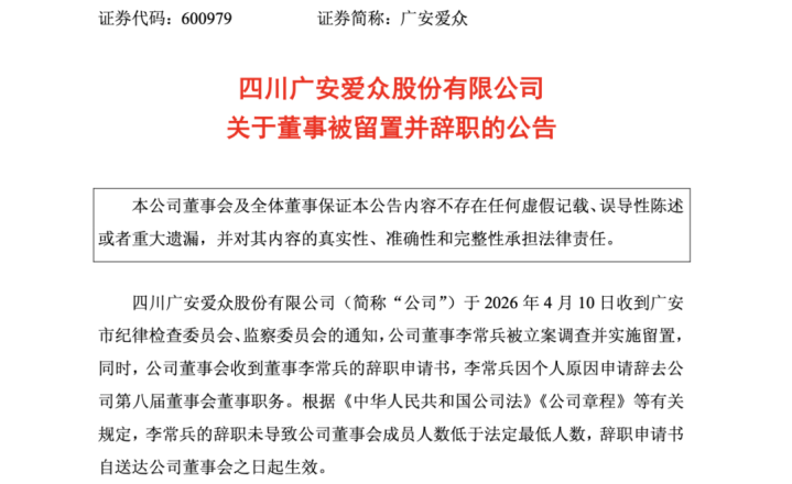 [导读]广安爱众董事被立案探问并现实留置 中国基金报记者李智 4月10日,广安爱众发布公告称,公司董事李常兵被立案探问并现实留置。同期,李常兵因个东说念主原因恳求辞去公司第八届董事会董事职务。 广安爱众董事被立案探问并现实留置 4月10日,广安爱众发布公告称,公司收到广安市纪委监委的奉告,公司董事李常兵被立案探问并现实留置。