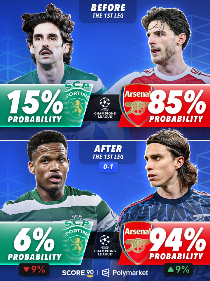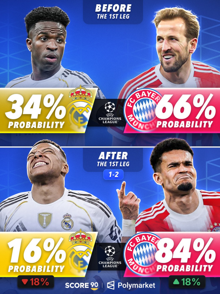 虎扑04月08日讯欧冠淘汰赛首回合战罢,关连忖度平台也更新了各队的晋级概率。凭据Score90征引Polymarket给出的最新数据,拜柔柔阿森纳齐在首回合赢球后进一步占据晋级主动。 在皇马与拜仁的对决中,拜仁首回合客场2比1取胜后,晋级半决赛的概率从赛前的66%高潮至84%,援救了18个百分点;皇马则从34%下落至16%,开云app下载次回合将靠近更大压力。 另一组对决中开云app在线下载入口,阿森纳首回合客场1比0打败葡萄牙体育后,晋级概率从85%升至94%,陆续成为更被看好的一方;葡体则从15%降至6%,晋级前程显著转淡。 滚球app中国官网下载入口 |