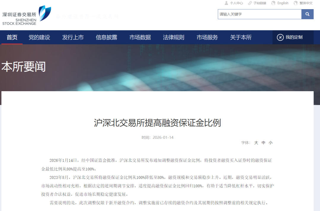 据深交所官网,2026年1月14日,经中国证监会批准,沪深北交易所发布通知调整融资保证金比例,将投资者融资买入证券时的融资保证金最低比例从80%提高至100%。 2023年8月,沪深北交易所将融资保证金比例从100%降低至80%,融资规模和交易额稳步上升。近期,融资交易明显活跃,市场流动性相对充裕,根据法定的逆周期调节安排,适度提高融资保证金比例回归100%,有助于适当降低杠杆水平,切实保护投资者合法权益,促进市场长期稳定健康发展。 {jz:field.toptypename/}需要说明的是,此次调整仅限于新开融资合约,调整实施前已存续的融资合约及其展期仍按照调整前的相关规定执行。