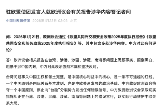 1月23日,中国驻欧盟使团发布发言人就欧洲议会有关报告涉华内容答记者问。 问:2026年1月21日,欧洲议会通过《欧盟共同外交和安全政策2025年度执行报告》《欧盟共同安全和防务政策2025年度执行报告》等,其中包含多处涉华内容。中方对此有何评论? 答:欧洲议会相关报告在台湾、涉港、涉疆、涉藏、南海等问题上罔顾事实、颠倒黑白,kaiyun体育粗暴干涉中国内政,中方对此表示强烈不满和坚决反对。 {jz:field.toptypename/}台湾问题事关中国主权和领土完整,开云是中国核心利益中的核心,是一条不可逾越的红线。一个中国原则是国际关系基本准则,也是中欧关系发展的政治基础。中方敦促欧洲议会恪守一个中国原则,停止向“台独”分裂势力发出任何错误信号。中方敦促欧洲议会采取切实措施纠正在台湾、涉港、涉疆、涉藏、南海等问题上的错误言行,以实际行动维护中欧关系大局。