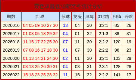 上期双色球的开奖号码中,和值为141,跨度为17,012路比为2:2:2。 双色球最近7期奖号和数据分析表