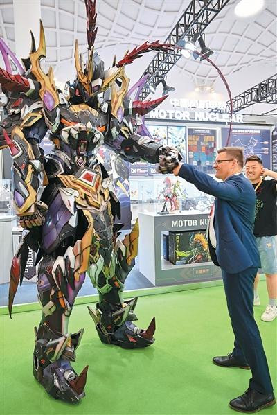 第六届中国国际挥霍品展览会上,别称番邦参不雅者与中国风机甲东说念主偶互动。 新华社记者 郭程摄